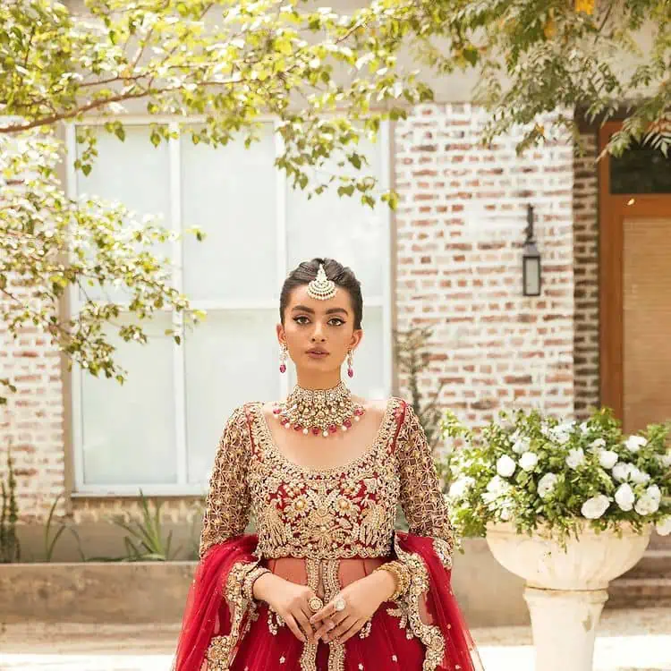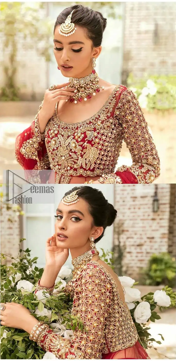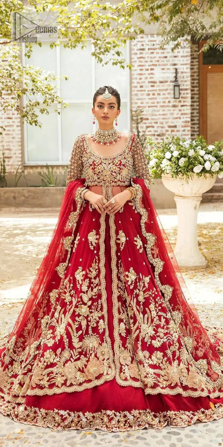 Vibrant outfit to make your reception day more shiny and bright. DeemasFashion presents this maxi in deep red colour, featuring golden embroidery which is enhanced with tilla, dabka, kora, naqshi, zardozi and the magic of Resham. The following scalloped front open maxi has a Round neckline to meet the traditional look. In addition to this, it is paired up with a back train lehenga in the same colour framed with embroidery on the border. Complete this article with a scalloped dupatta which is adorned with four-sided borders and sequins sprayed all over for sun-kissed splendour!