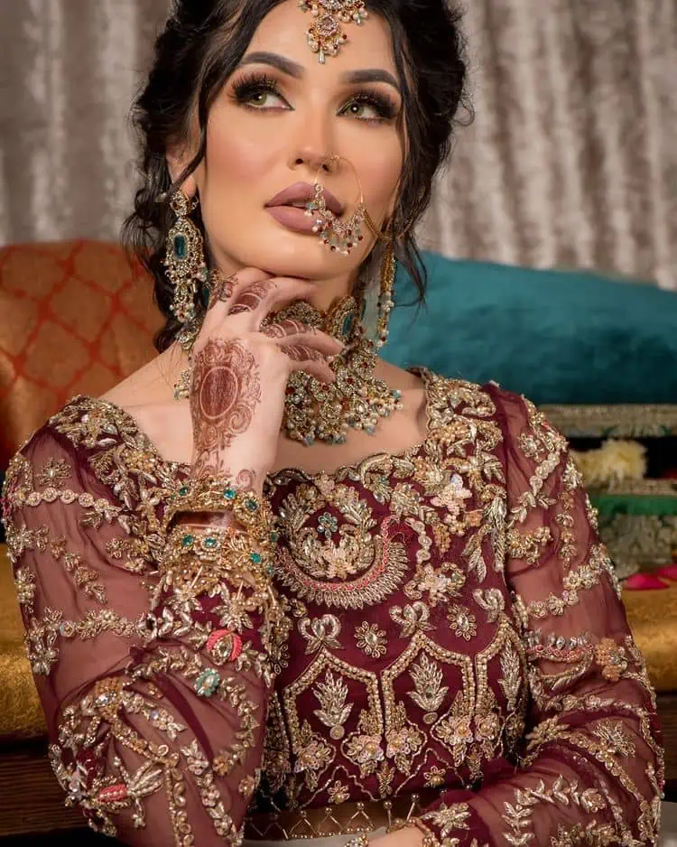 - Work includes kora, dabka, stones, sequins, beads, silk threads and Swarovski crystals.