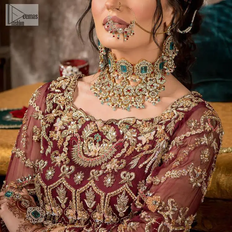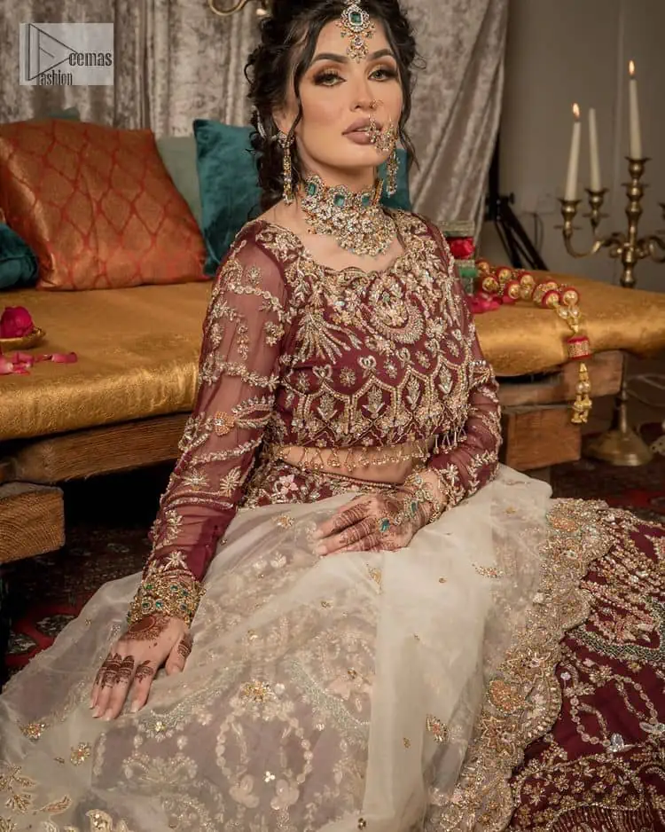 Take your style up a few notches in this elegant reception piece. A pure organza maroon fluffy lehenga is beautifully adorned with golden embroidery and enhanced with tilla, sitara, pearls, dabka and zardozi work. It is paired up with a blouse choli with tilla motifs on the full sleeves along with boat shape neckline to make your Big day astonishing and remarkable. The ivory organza dupatta has a four-sided embroidery adorned with pearls and Sitara and is framed with a scalloped style.