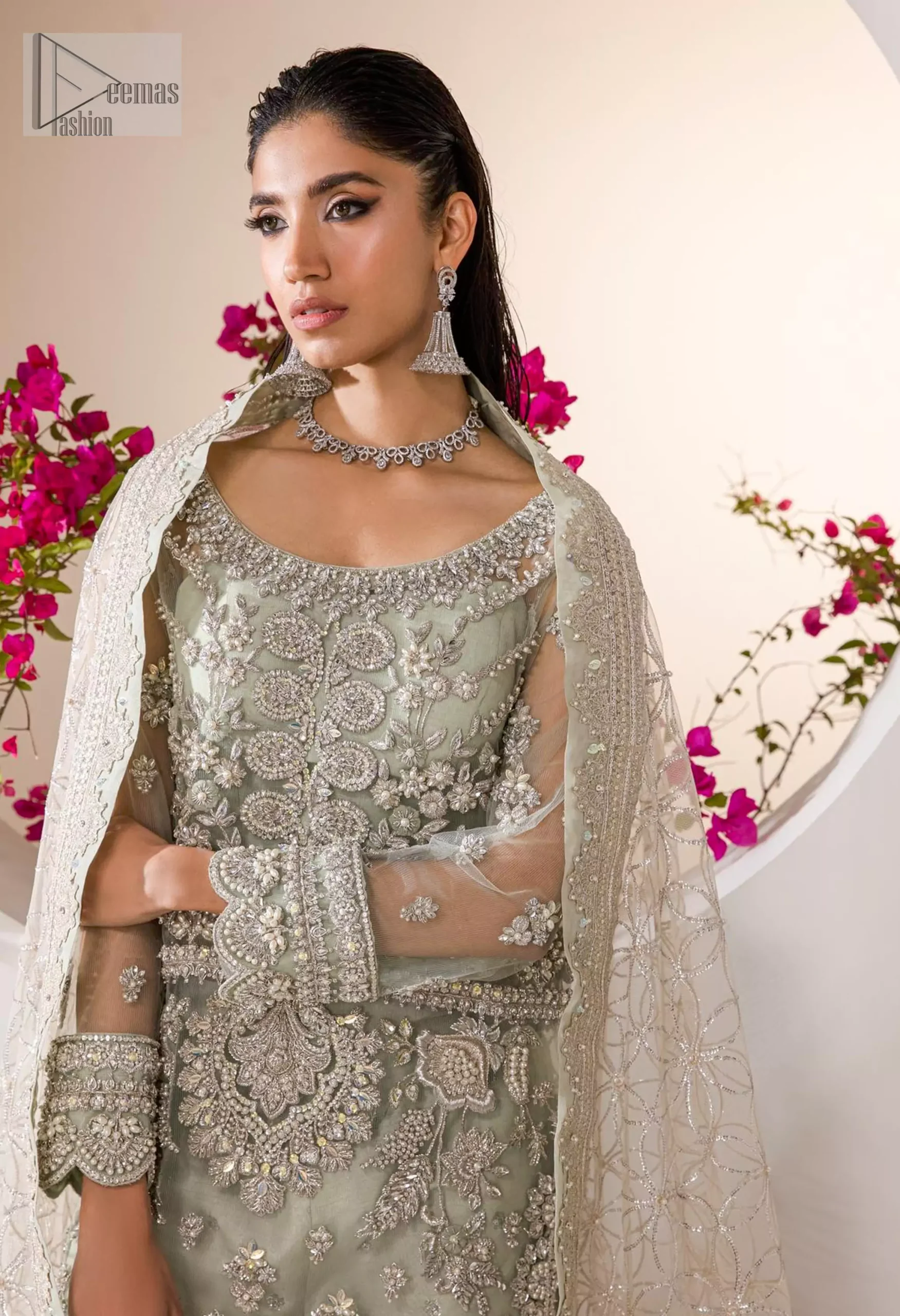 Radiate pure elegance with the Mint Long Shirt Scalloped Palazzo Pants, a perfect choice for the modern Nikah bride. The long shirt, crafted from luxurious organza, flows effortlessly, accentuated by delicate silver embroidery that shimmers with every step. The round neckline and full-length sleeves create a graceful, timeless silhouette, while the scalloped hem adds a touch of whimsy. Paired with flowy palazzo pants, this outfit blends tradition and contemporary chic. The delicate mint hue exudes freshness, wrapping you in a dreamy aura ideal for your special day. This is an ensemble where elegance meets modernity in perfect harmony.