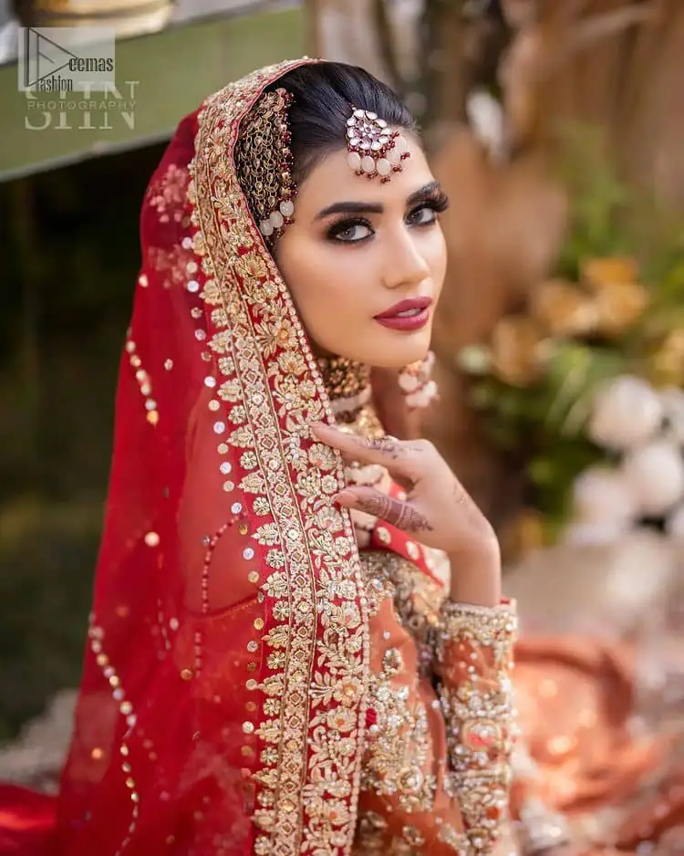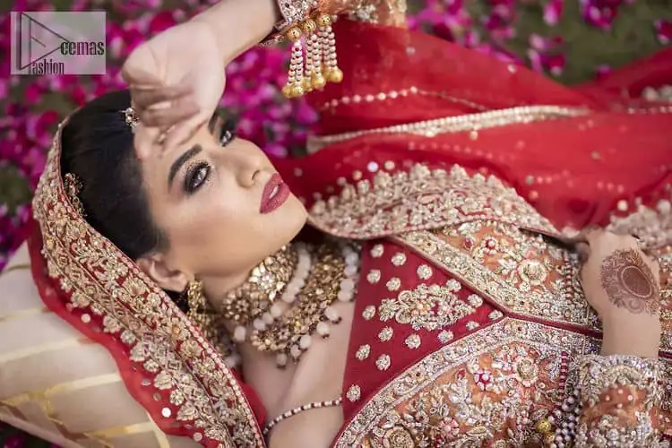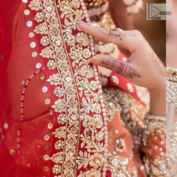 Shine bright in the sparkling ensemble from Deemas Fashion. Introducing this reception outfit, which has rust pathways. This front open fish was dipped in the richest shade of rust and is ornamented with golden embroidery, further intensified with tilla, dabka, sequins and the real magic of zardozi. The strap neckline of the Pishwas gives a unique aesthetic sense to the whole attire. It is coordinated with an ivory lehenga with golden embroidery embellished on its border. Finish this article with a dupatta framed with a four-sided embroidered border, and sequin sprayed all over.