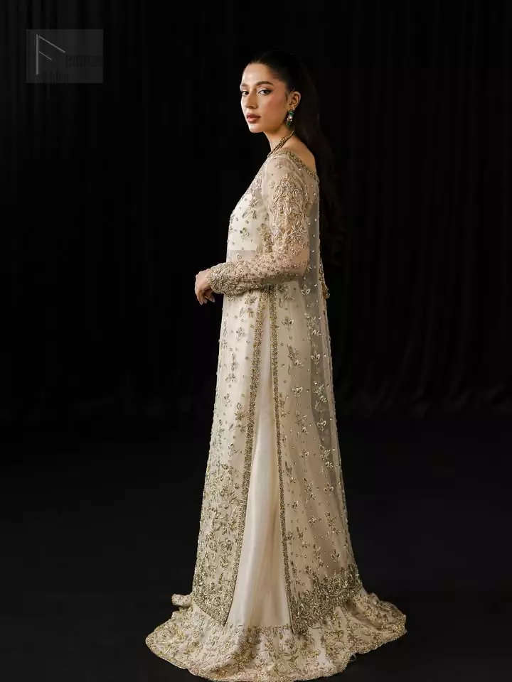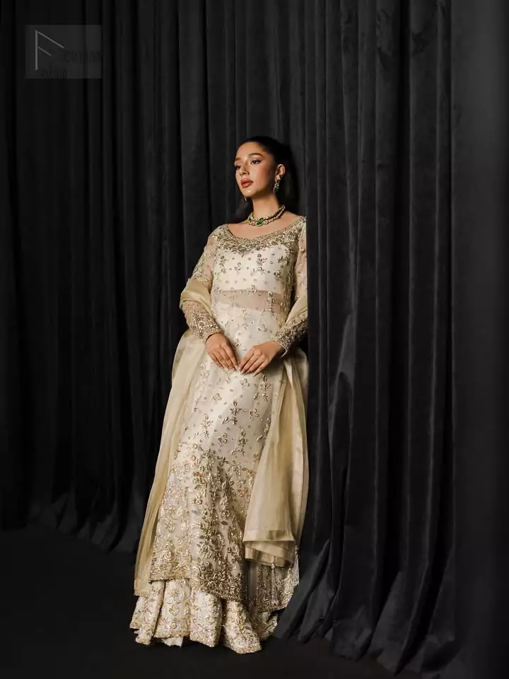 When there’s a formal event, an ivory long shirt paired with a sharara and dupatta will make things sparkle. This long-length attire features full sleeves, a remarkable combination that is both traditional and serene. Organza is used to tailor this outstanding attire, while the shirt comes with a side-open design to keep things chic and mesmerising. But just when that wasn’t enough, a perfectly round neckline and extremely delicately worked silver & golden embroidery make the ensemble absolutely wholesome. The flared sharara pants offer a comfortable yet stylish drape, moving fluidly with you for effortless grace. Designed to captivate at bridal events or as a guest, it balances understated glamour with lasting impression. So, whether it’s a party or an event, the ivory long shirt, sharara and dupatta are exactly what you need.